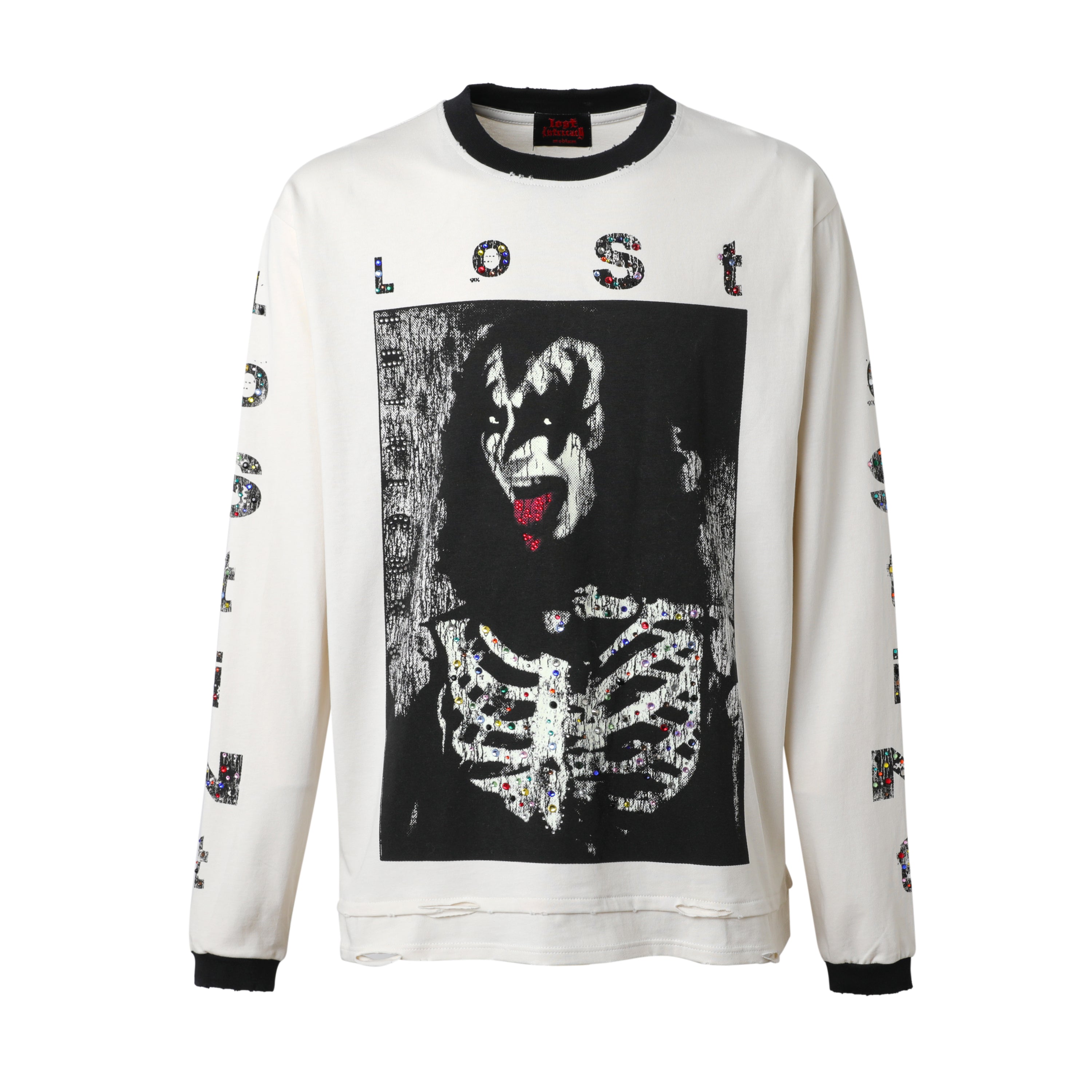 Multicolor “LOST” rhinestone detailing printed on sleeves and chest